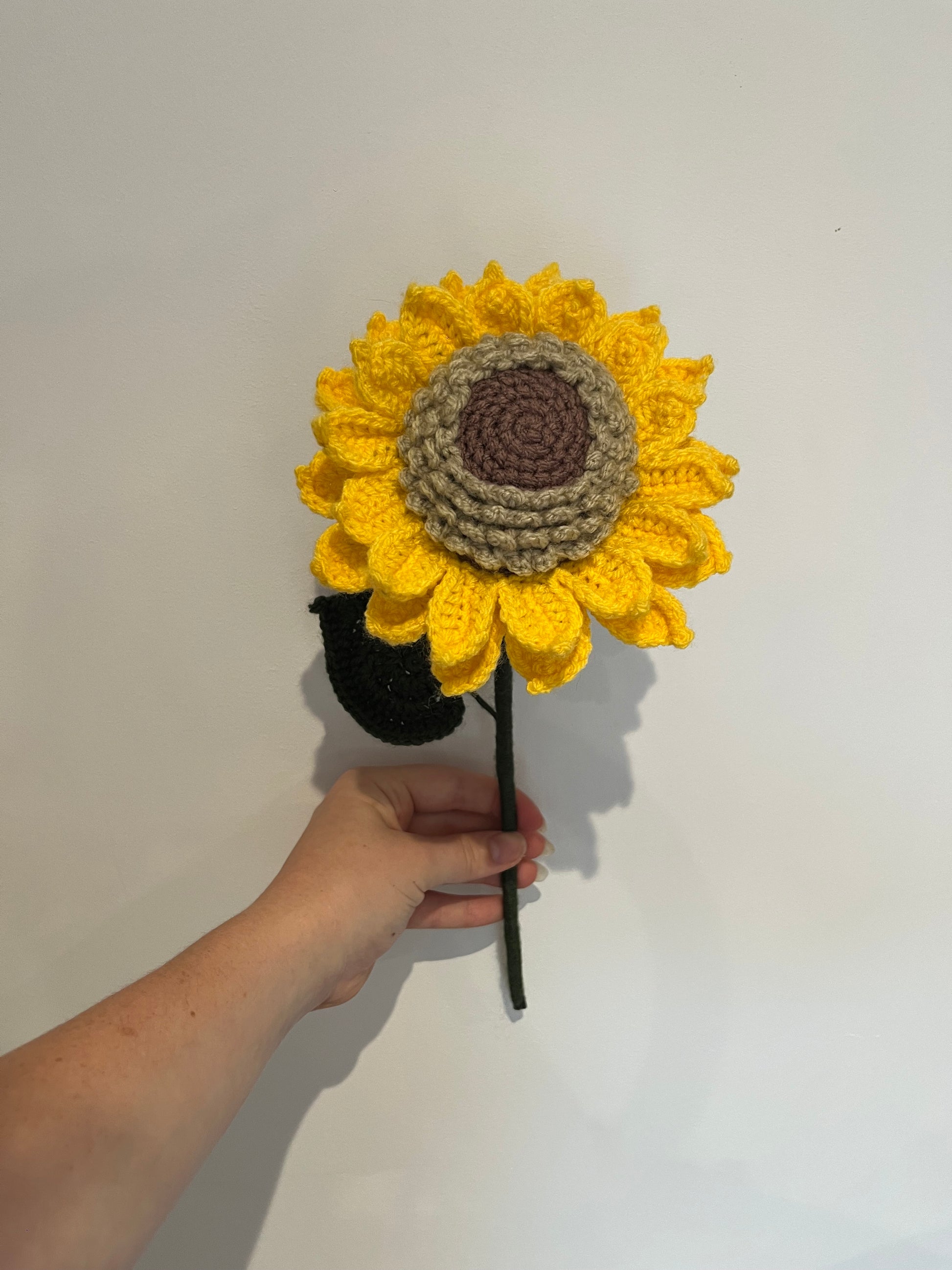 Ce magnifique tournesol entièrement réalisé au crochet capture toute la majesté et l'énergie de cette fleur emblématique. La création présente une fleur de grande taille aux multiples pétales finement travaillés, disposés en couronne autour d'un cœur central richement texturé.